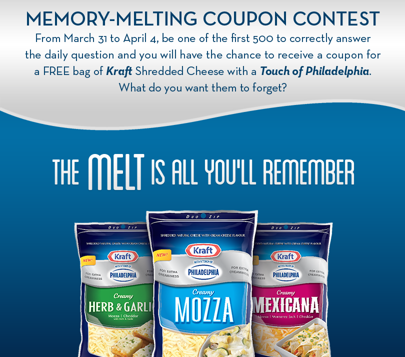 Hurry! Be one of the first 500 to answer the daily question from Philadelphia and you could receive a coupon for a FREE bag of Kraft Shredded Cheese with a Touch of Philadelphia!