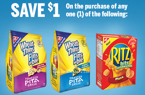 Save $1 off the purchase of WHEAT THINS Pita Original Cracker Chips 226g, WHEAT THINS Pita Garlic Cracker Chips 226g, or RITZ BITS Pizza Flavoured Cracker Sandwiches 180g