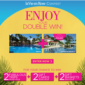 Enter for your chance to win the Ultimate Double Prize! One lucky winner will win 2 fabulous trips (Mexico & Dominican Republic), 2 $1000 Gift Cards to la Vie en Rose and 2 la Vie en Rose Gift Baskets!