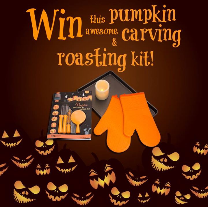 Enter for your chance to win a Pumpkin carving & roasting prize pack! Kit includes a pumpkin carving and stencil kit, an LED flameless candle, a pair of silicone oven mitts, a premium non-stick 10 in x 15 in cookie sheet.