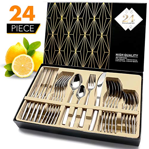 - 【 HIGH QUALITY 24 PCS SILVERWARE SETS】 Simple and modern design, made of high quality stainless steel with mirror finish polishing, outstanding heat and rust resistance to ensure great longevity, appropriate weight and thickness for maximum comfort. (It is also the first choice of upscale flatware sets for daily reception of guests.