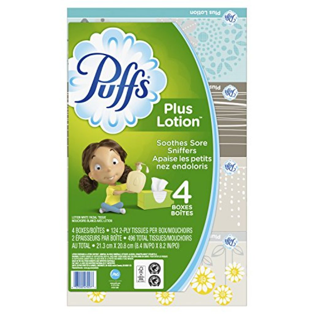 - Pack includes 4 Family Boxes (124 Tissues per Cube) of Puffs Plus Lotion Facial Tissues