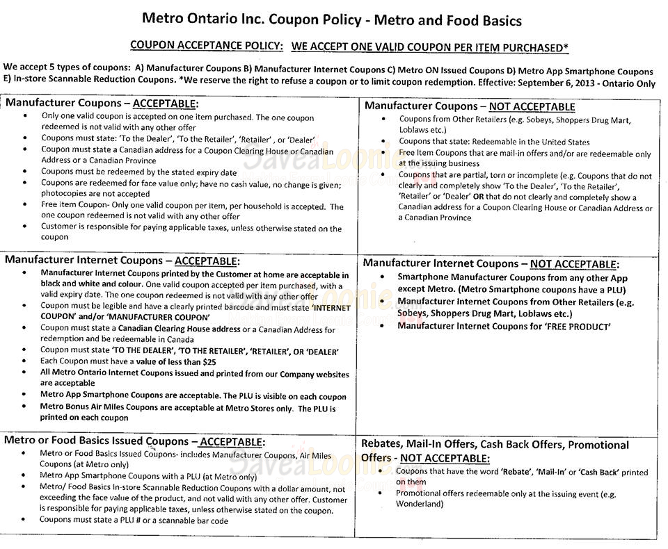 We accept Canadian manufacturer coupons, competitors’ coupons and some internet coupons.