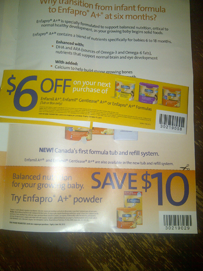 These coupons came in the Enfamil Magazine. I receive this magazine a few times a year for signing up with the Enfamil Club. The coupons in this edition are for $6.00 off Enfamil A+, Enfamil A+ Gentlease or Enfapro A+ and $10.00 off Enfapro A+ Powder.