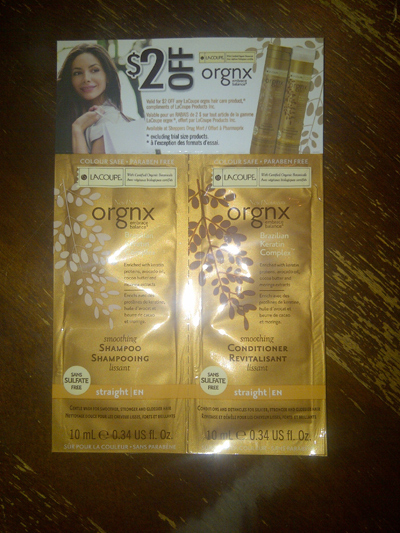 This sample of La Coupe Organix shampoo & conditioner came from entering a contest with The Kit (offer over). Once I try out these samples, I can email the address provided and be entered into a draw to win a $150 gift basket.