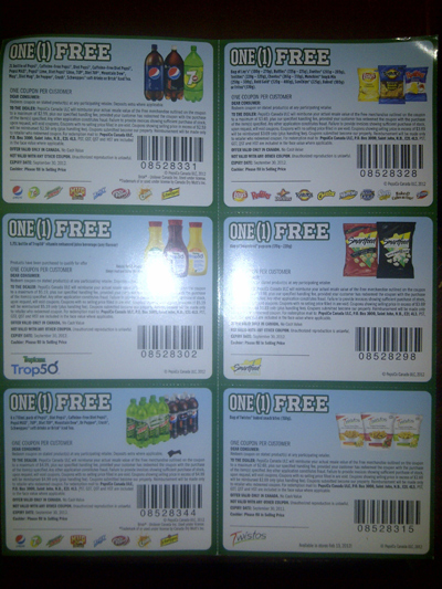 We also got our coupon booklet from the Pepsi-Tositios Mail in Rebate offer (now over). For this offer we had to purchase $20.00 in participating products and send in the receipt and form. In return we got $20.00 in free product coupons for PepsiCo products.