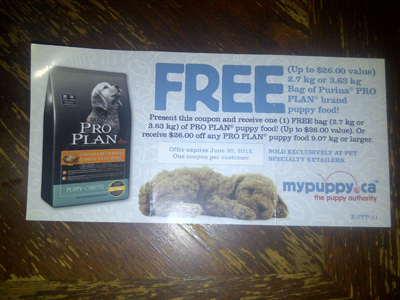 One of our lovely members contacted us just after we got our new puppy, Ella. She had received this coupon and wasn’t planning on using it so she offered to donate it to us! This coupon is for a free bag of Purina Pro Plan Puppy Food and will definitely come in handy:)