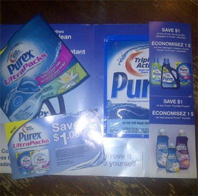 Our Purex samples also arrived 🙂 We got one of each so we could test out both! The UltraPacks came with a coupon for $1.00 off and the liquid detergent came with 2 coupons, one for $1.00 off Liquid Laundry Detergent and one for $1.00 off Purex Crystals. Not quite as good an offer as last year, but we’ll take it!