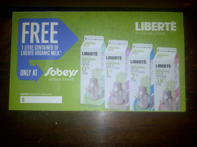 We received this FPC for 1 litre of Liberte Organic Milk redeemable at Sobeys Urban Fresh. However, we didn’t realize until we had already ordered it, that there are only a handful of these stores and they are all in the GTA! Poo!