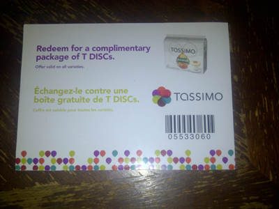 We also received this FPC from Tassimo for a free package of T-Discs. We own a Tassimo brewing system and when we phoned in regarding the brewer recall we also found out that we had an unopened pack of Espresso discs that were also on recall. So they instructed us to throw out the package and they sent us this coupon to replace it 🙂