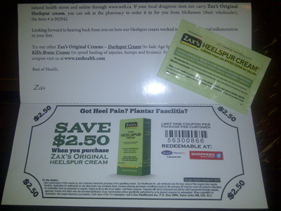 This sample didn’t take long to come at all, just a couple weeks. It is a sample of Zax’s Heelspur cream and also came with a coupon for $2.00 off redeemable at Rexall or SDM.