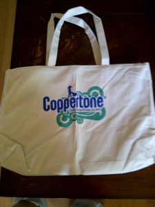 I was SUPER happy to see my Coppertone bag finally got here! It feels like I have been waiting for it forever. I got this bag through a Facebook give away quite awhile back, it is over now. It is a really high quality material and looks very durable. The bag is actually to seperate plastic covered compartments that zip up seperately. The two seperate compartments than are able to fold up and velcro together to be carried like a bag. Going to be perfect for trips to the beach while we are camping!