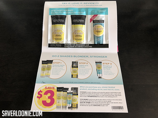Another Topbox sample graced my mail box – this time from John Frieda! This John Frieda sample pack includes Go Blonder Shampoo, Conditioner & Lemon Miracle Mask + a coupon for $3.00 off.