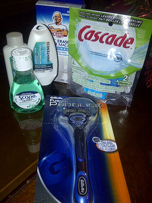 It came with a Gillette Fusion Pro-Glide razor, Cascade samples, Scope sample, Pantene Shampoo & Conditioner sample and a Mr Clean Magic Eraser. What another awesome sampler