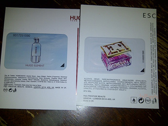 We also received some his and hers fragrance samples this week. We got 2 of the Hugo Element samples and an Especially Escada sample.