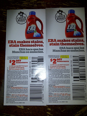 We also received our $2.00 off ERA coupons from the ERA StainKicker game. There are still lots of dates to play for instant win! We won T-Shirts just the other day!