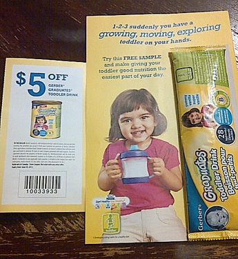We received 2 of these samples for Gerber Graduates Toddler Drink today. They each came with a $5.00 off coupon that expires June 30, 2012. We won’t be using these samples any time soon and they expire in April so we will be giving them to some one who needs it! This sample is still available.