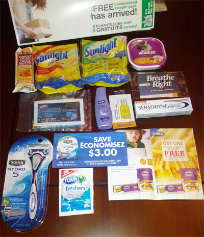Our SampleSource pack also arrived on Friday and boy-oh-boy was it packed (over)! We got a Quaker granola bar, Sunlight dishwasher tabs, Sunlight laundry detergent, Whiskas cat food, Clorox Electronics wipes, Nivea Body lotion, John Frieda Frizz-Ease, Breathe Right strips, Sensodyne toothpaste, Schick Hydro 5 razor, Tums Freshers, $3 Schick coupon, and a Catelli Smart FPC.
