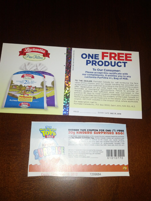 Along with our dollar and cents coupons we also got a couple of FPCs! Our Kinder Egg FPC (gone) arrived from Save.ca. I was also surprised with an FPC from Lactantia for a bag of milk.