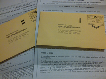 We also received these formal letters/contracts from the Era StainKicker Sweepstakes. We each won a $2.00 off Era detergent coupon. These contracts are from the same company as the Cheer contract we received on Monday. Both of these have skill-testing questions and have to be returned to the Company by October 5. I’ve never seen anything like this for a sample and now we’ve gotten 2 different ones in the same week. New trend? We thought they were more of our Cheer gifts from the Dig It Get It contest. But no such luck. Still very excited to get the actual coupons now!