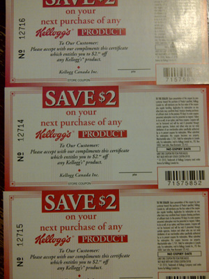 I also received these 3 coupons from Kellogg’s. I sent them an email quite awhile ago requesting coupons and this is what they sent. I got 3 x $2.00 of ANY Kellogg’s product with NO EXPIRY DATE!! WOOOO!!! These are great coupons :D