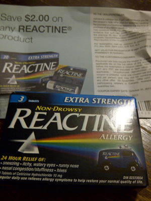 Today I got my free sample of Reactine from their last giveaway. There are 3 tablets in the sample and it also came with a $2.00 off any reactine product coupon. The coupon expires October 31, 2011.