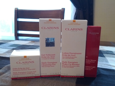 And last but certainly not least, this awesome prize pack from Clarins arrived on Friday! Woohoo! I was lucky enough to be one of the 10 winners of a My First Clarins prize pack from a contest on their Facebook Page! I used to never enter contests because I never won – but now that I’m in the habit of entering contest every day I’ve won 2 in month! This great Clarins prize came with Daily Energizing Cream-Gel, Daily Energizing Cleansing Gel, Daily Energizing Wake-Up Booster and Instant Light Natural Lip Perfector. I believe the ERV of this prize was around $75! Thank You Clarins!