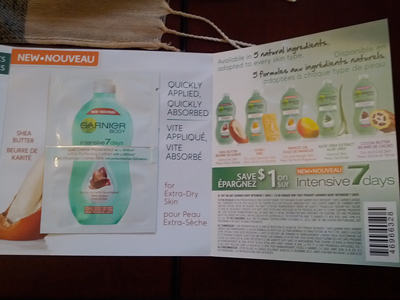 I really do feel badly for the fiasco that happened with the Garnier Canada giveaway! I do however have to give them kudos on how amazingly they handled it – there was no remuneration necessary but they were generous enough to award everyone involved an FPC. Not to mention their samples showed up super quick! On Friday our free sample of Garnier Body Lotion arrived! Also included in the packaging was a coupon for $1 off.