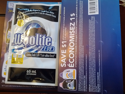 Our free sample of Woolite Zero laundry detergent arrived this week! This is another sample that seemed to take forever to get here! Included in the packaging is a coupon for $1 off Woolite.