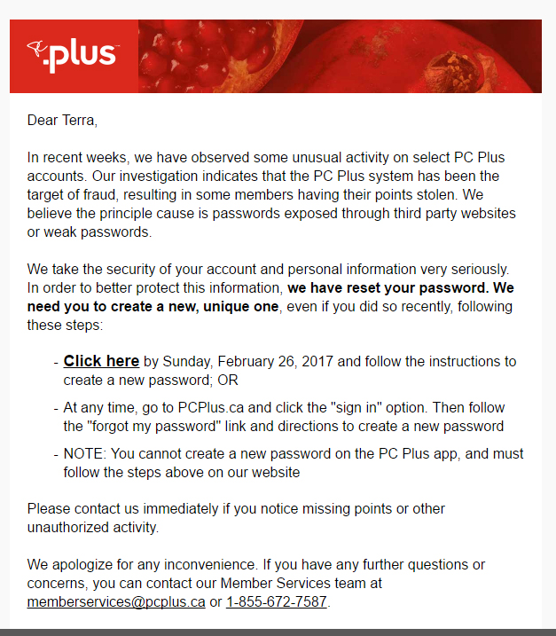 *UPDATE Feb 21st* Loblaws has sent out a mass email to ALL PC Plus Members with notice that ALL user passwords have been reset. Click the link in your email, or visit the PC Plus website by February 26th to update your password. Even users who have recently updated their passwords have been reset, as a precautionary measure.