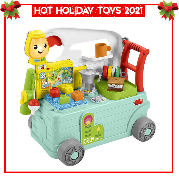 The Fisher-Price Laugh & Learn 3-in-1 On-The-Go Camper grows with your baby from sitting to walking to pretend play! Includes 3 Smart Stages learning levels with 100+ songs, sounds and phrases that teach colors, counting 1-10, shapes, and the alphabet in English and French.