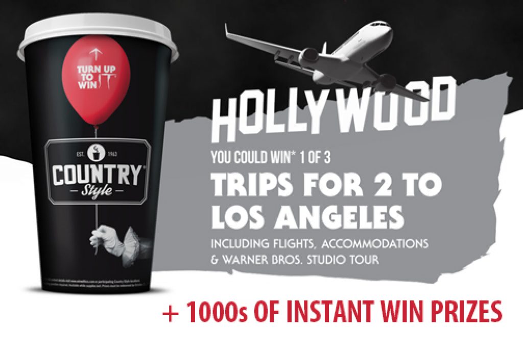 Purchase a participating Hot Beverage at Country Style and turn up your rim for your chance to win 1 of 3 Trips for 2 to Los Angles including flights, accommodations and Warner Bros. Studio Tour!