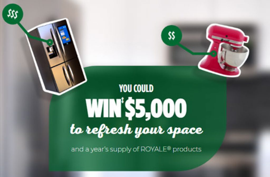 Enter for your chance to win a Year Supply of Royale Products + a $5000 Gift Card to purchase whatever you want/need to spruce up your kitchen, backyard, bathroom or living room!
