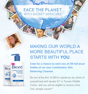 Face the Planet with Biore! Upload an oily photo of yourself and lots of great things will happen! You will be entered into a draw to win 1 of 250 full sized bottles of Biore Combination Skin Balancing Cleanser. Also, if you are one of the first 10,000 to upload your photo, Biore will donate $1.00 to the Toronto Wildlife Centre and you will receive a 7ml sample sachet of Biore Combination Skin Cleanser.