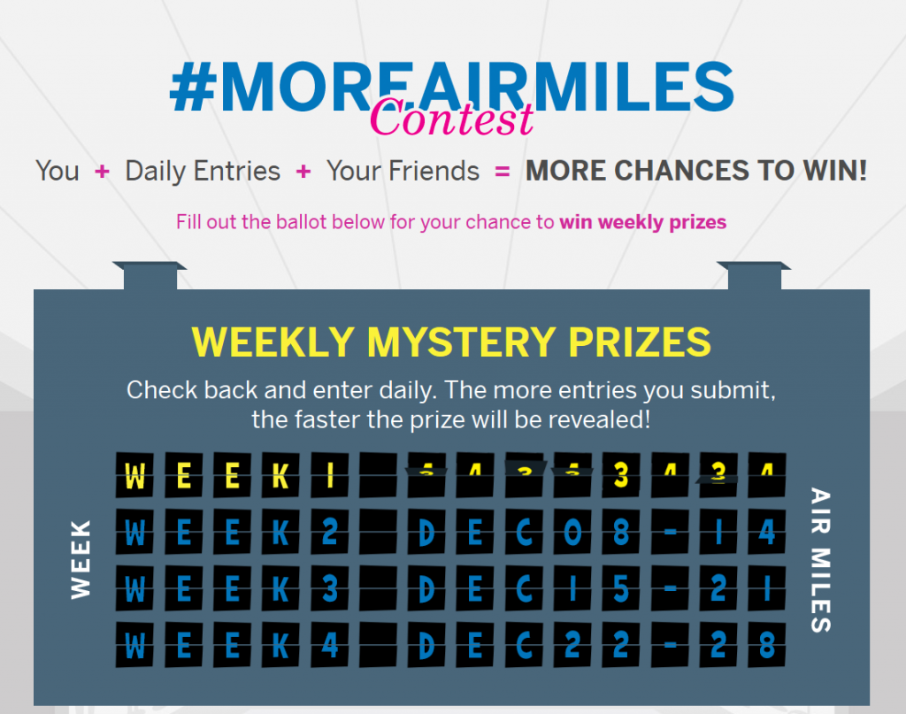 Enter and you could win 1 of 4 Weekly Prizes of Free Air Miles! Prize amounts include 5,000 Air Miles Reward Miles, 10,000 Air Miles Reward Miles, 25,000 Air Miles Reward Miles & 50,000 Air Miles Reward Miles.