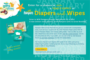 Pampers Gifts to Grow Rewards has got you covered with a sweepstakes every mom will love. Coupons for 58 jumbo Pampers Diaper packs, and 58 tubs of Pampers Wipes. Enter as often as you’d like with the use of 20 points per entry, or you can also enter by mail because there’s a no purchase necessary to enter this sweepstakes. Prize value is estimated at $749. There’ll be a new winner every month.
