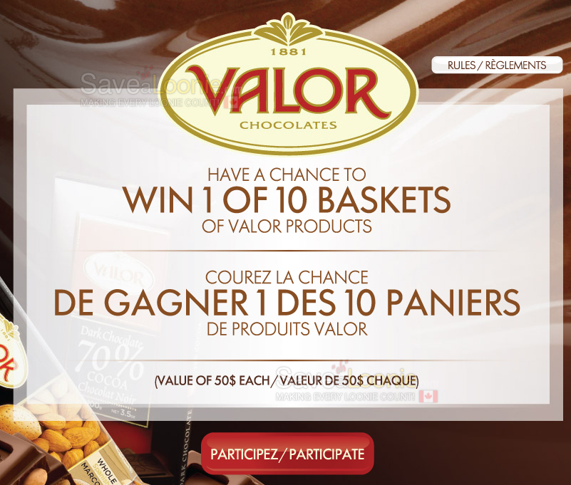 Enter for your chance to win 1 of 10 Valor Chocolate Product Baskets valued at $50 each. Contest ends June 16th 2013, 23:59