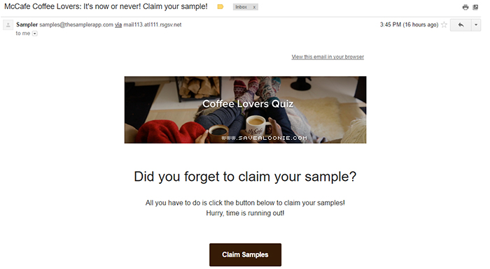 Yesterday afternoon (Jan 16th) I received an email from Sampler inviting me to claim ANOTHER box of McCafe K-Cups!