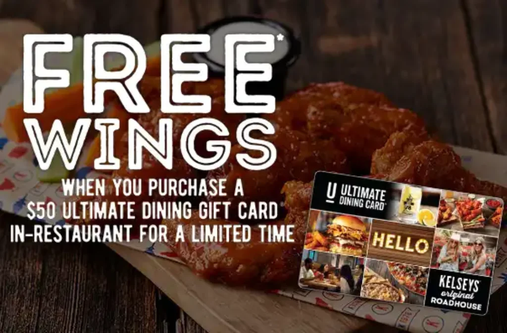 This season, when you purchase a $50+ Kelseys Ultimate Dining Gift Card at participating Kelseys restaurants, youโll receive a coupon for one FREE order of 10 wings – perfect for your next visit when you order a beverage. Itโs a tasty little bonus that makes gifting even more rewarding!