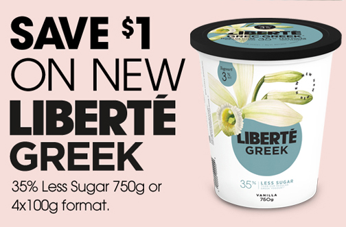 Claim this new Canadian Coupon and save $1.00 off the purchase of Liberte Greek 35% Less Sugar 750g or 4x100g format.