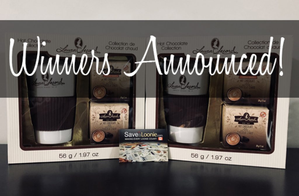 So it seems fitting that today, as the snow falls steadily outside our office window, I’m about to announce the winners of our Laura Secord Hot Chocolate Gift Set Giveaway!