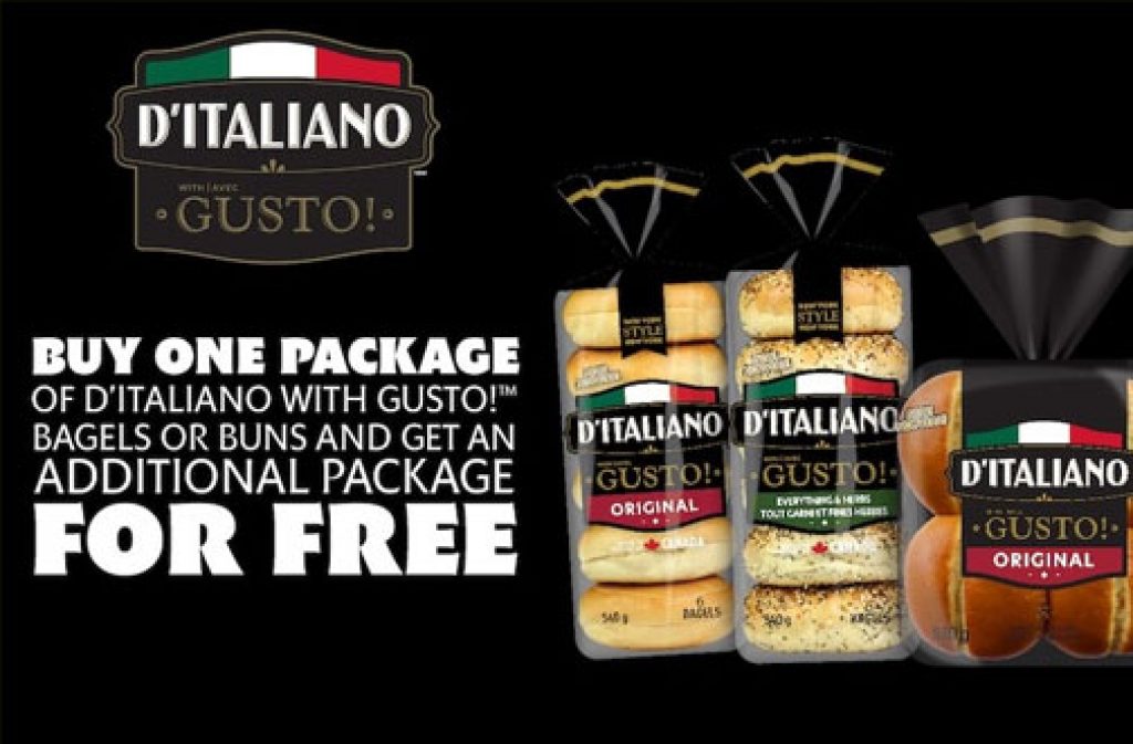 Buy one package of D’Italiano Gusto Bagels or Buns and get a 2nd Package for FREE