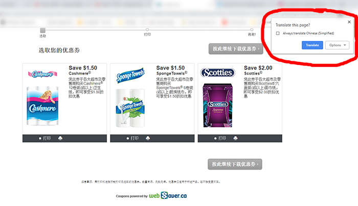 NOTE These coupons will first appear in Chinese but if you click the Translate button, you will be able to see the English wording. They do print with both English & Chinese writing on them.