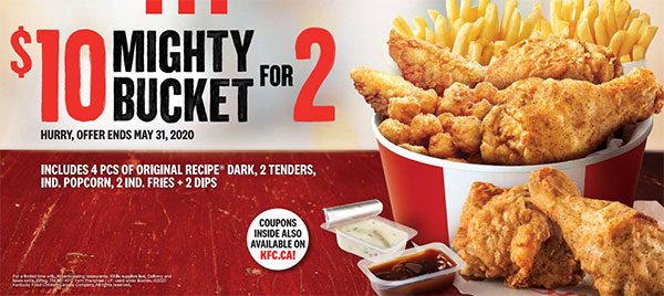 - $19.99 Ultimate Bucket for 2 4pc Chicken (dark), 4 Original Recipe Tenders, 2 Ind. Fries, 2 Ind. Sides & 2 Dips