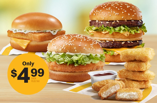 - $6.49 Meal Deal (Big Mac, Quarter Pounder with Cheese, McChicken, Filet-o-Fish or 6pce McNuggets + med Fries + med Drink)