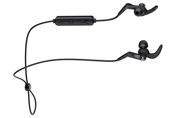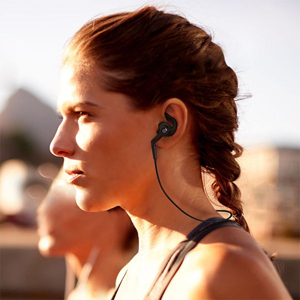 This set is super lightweight and comes with a carrying case for easy portability. With only a single cord that sits discretely behind your neck, you can say good-bye to twisted, tangled messes and struggling to keep your earbuds in place while moving about.