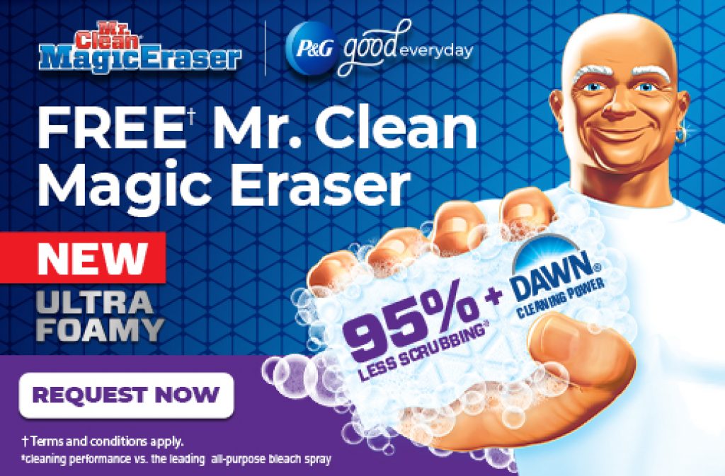 By registering to P&G Good Everyday, you can get a Mr. Clean Magic Eraser Ultra Foamy (1 pad) sample. This multi-surface cleaner combines the cleaning power of Dawn with the scrubbing power of Magic Eraser for a clean like you’ve never seen.