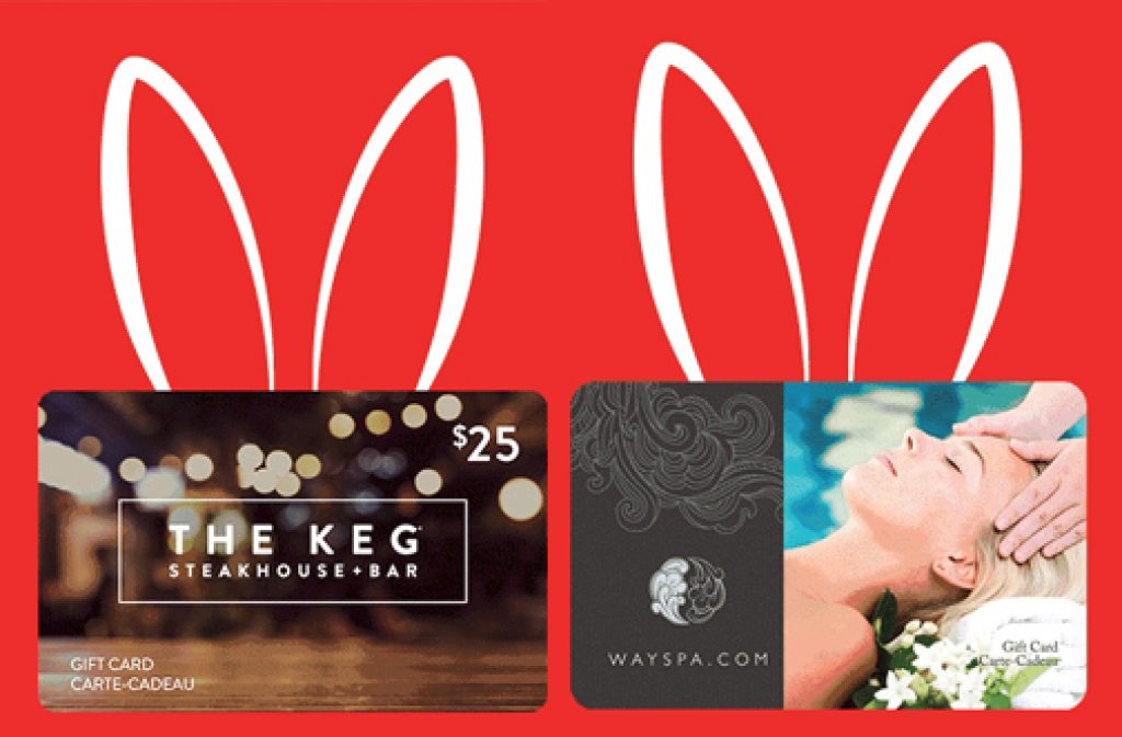 Valid on The Keg Steakhouse + Bar, Uber, WaySpa, or Life Experiences gift cards.