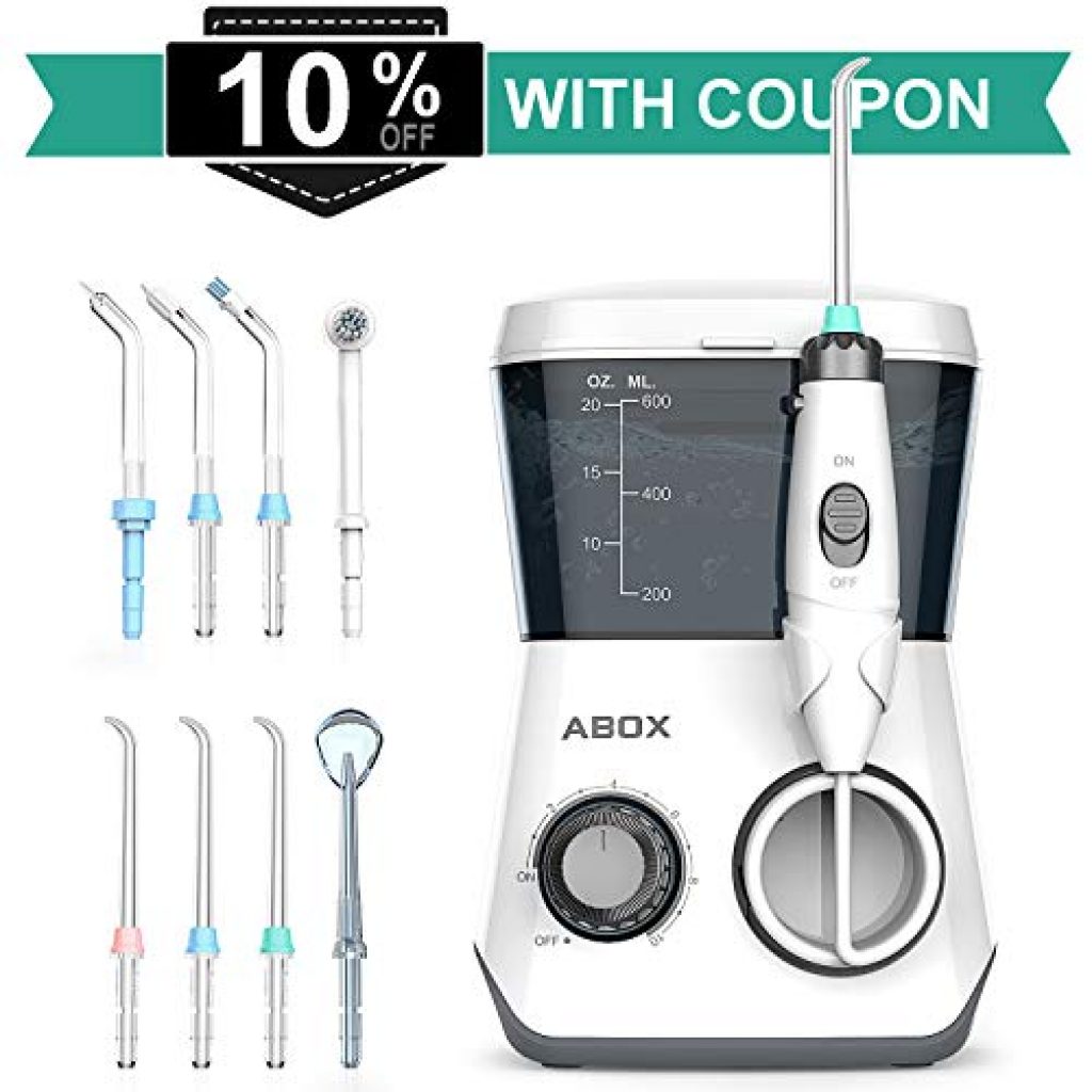- ADJUSTABLE 10 WATER PRESSURES: With 1250 to 1800 times per minute water pulsation and 30 to 125 PSI high water pressures, ABOX oral irrigator can power away plaque and debris between teeth and below the gumline, give you customized water pulsation for the best possible cleaning with even more comfort. The Adjustable 10 water pressure from soft to powerful to serve your different oral hygiene needs