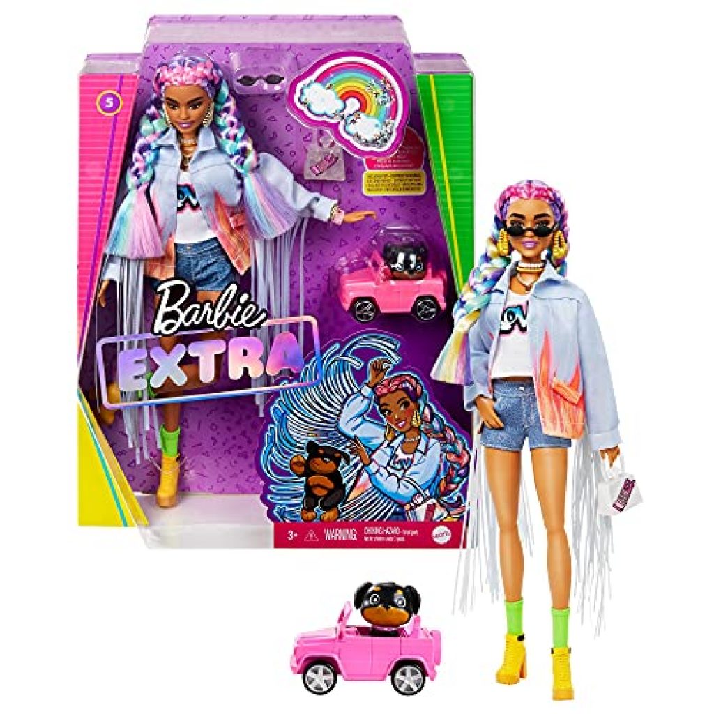 | Price history for Barbie Extra Doll #5 in Long-Fringe Denim Jacket with Pet Puppy, Rainbow Braids, Layered Outfit & Accessories Including Car for Pet, Multiple Flexible Joints | |